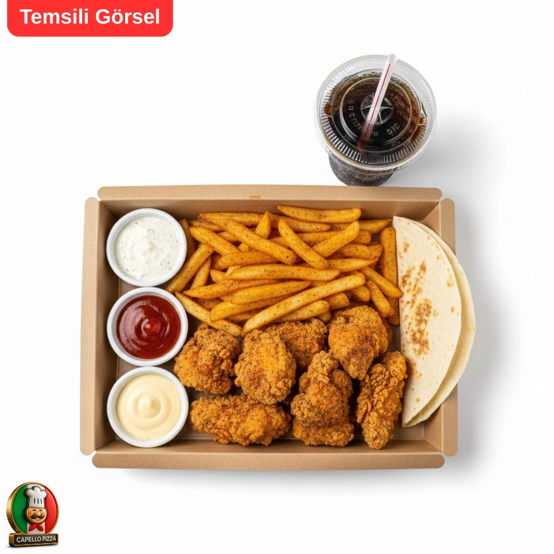 (200 gr çıtır tavuk + Baharatlı patates + Ranch sos + BBQ sos + Ketçap + Mayonez + Tortilla ekmeği + 25 cl içecek)