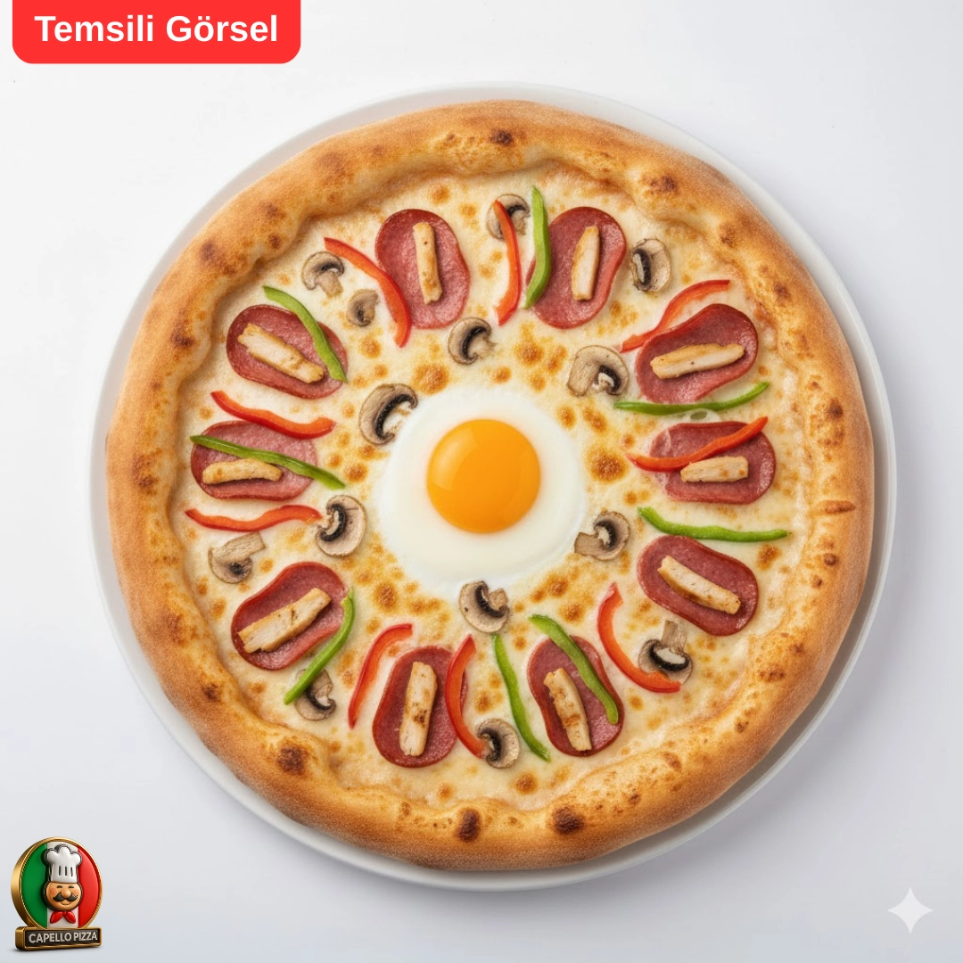 (Krem sos, Tavuk, Mantar, Sosis, Biber, Yumurta, Mozzarella peyniri)